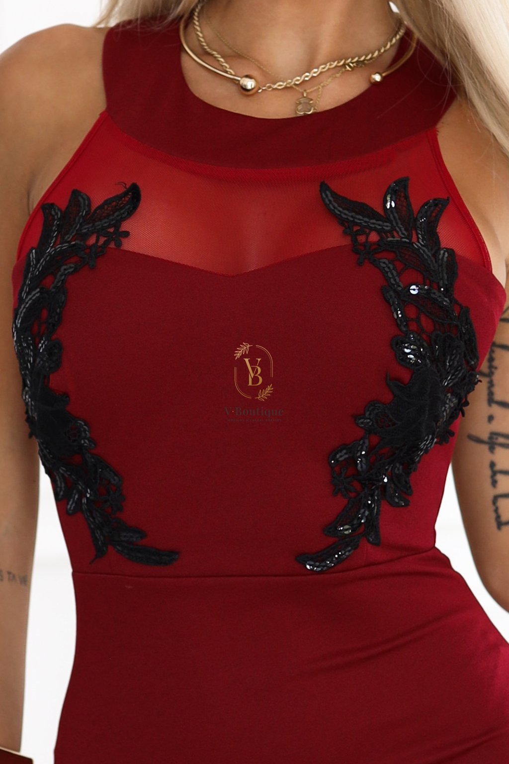 Vrchná časť šiat je zdobená priehľadnou vsadkou a čiernou čipkou, ktorá im dodáva zmyselný nádych a odlišuje ich od ostatných modelov. Maxi dĺžka a jemne rozšírený lem vytvárajú pôsobivý a elegantný vzhľad.