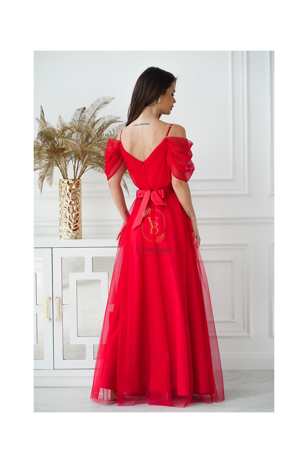 Výrazné červené spoločenské šaty, ktoré zaručene pritiahnu pozornosť. Jemne nariasený živôtik s V-výstrihom krásne zvýrazní dekolt, zatiaľ čo transparentné tylové rukávy spustené na ramená dodávajú modelu romantický a zároveň zvodný charakter.
