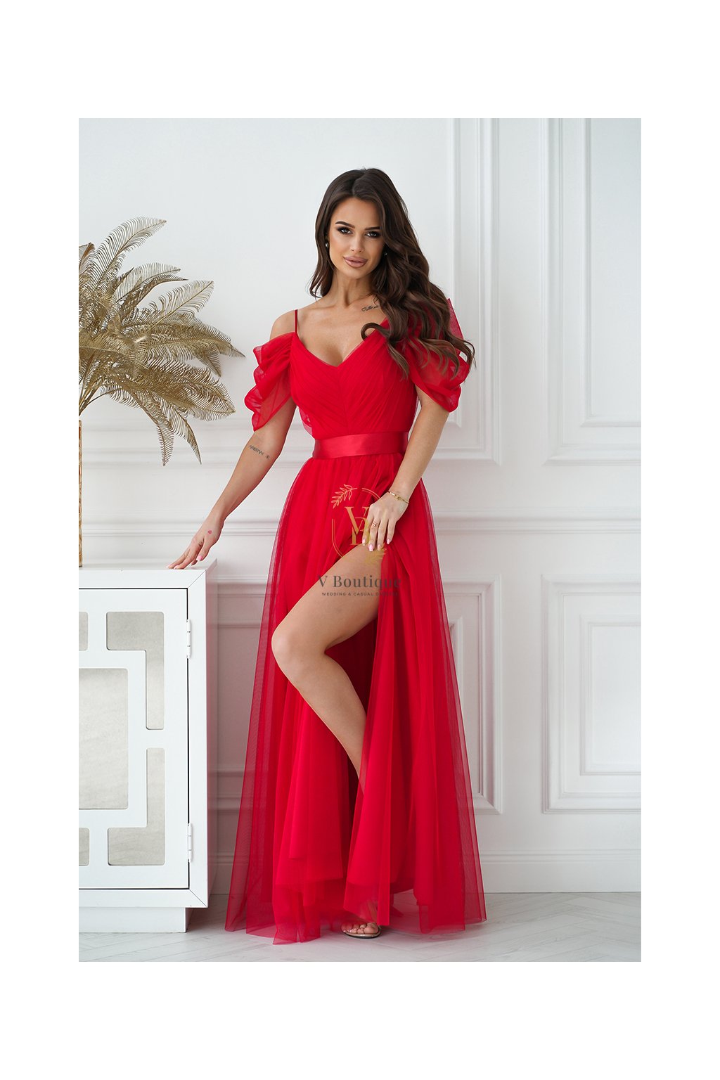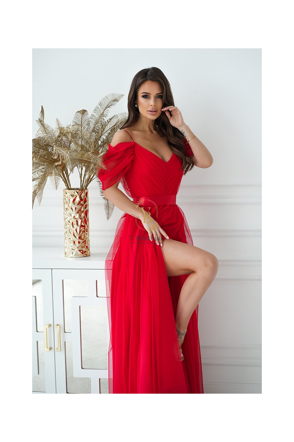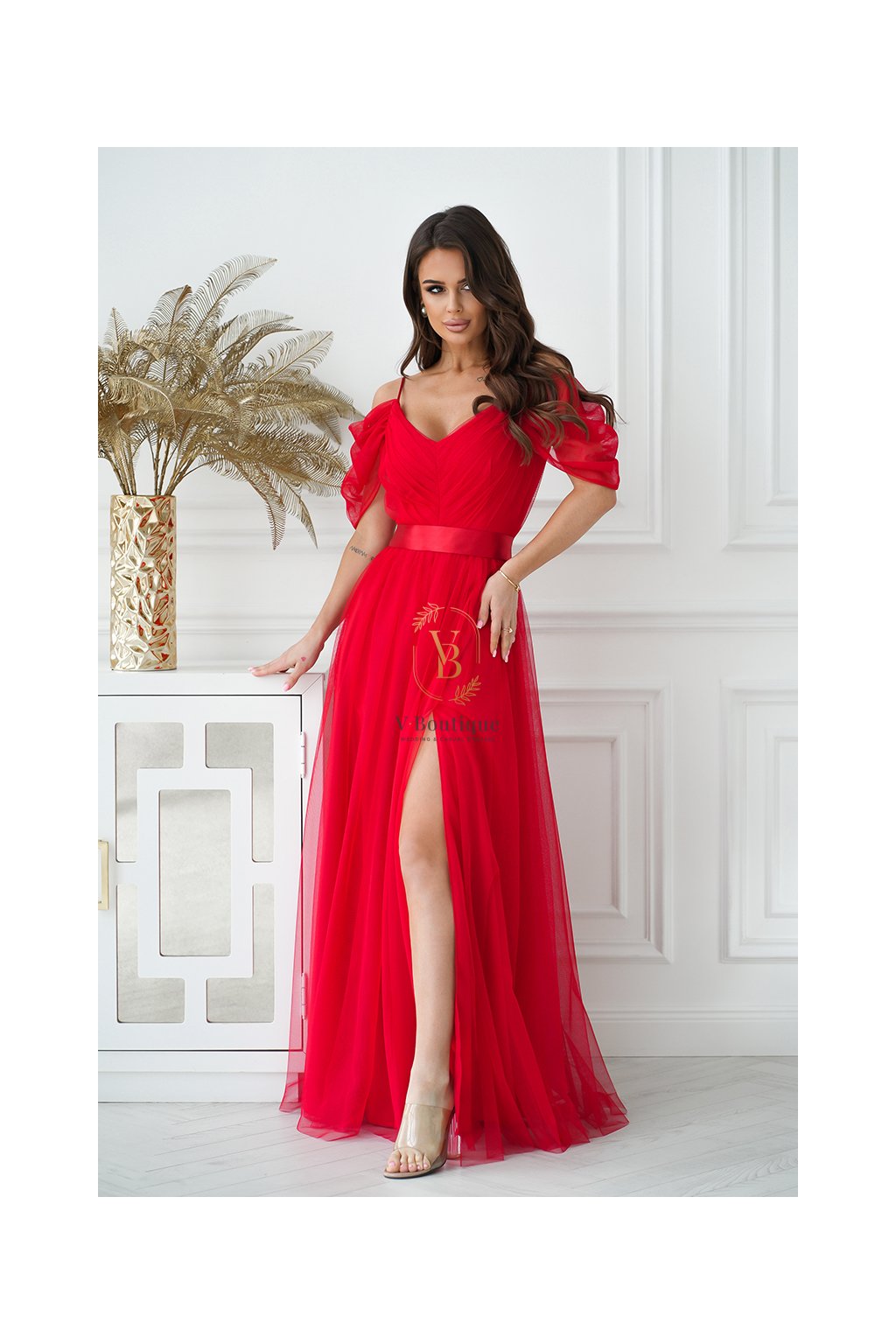 Červené dlhé tylové spoločenské šaty s rozparkom