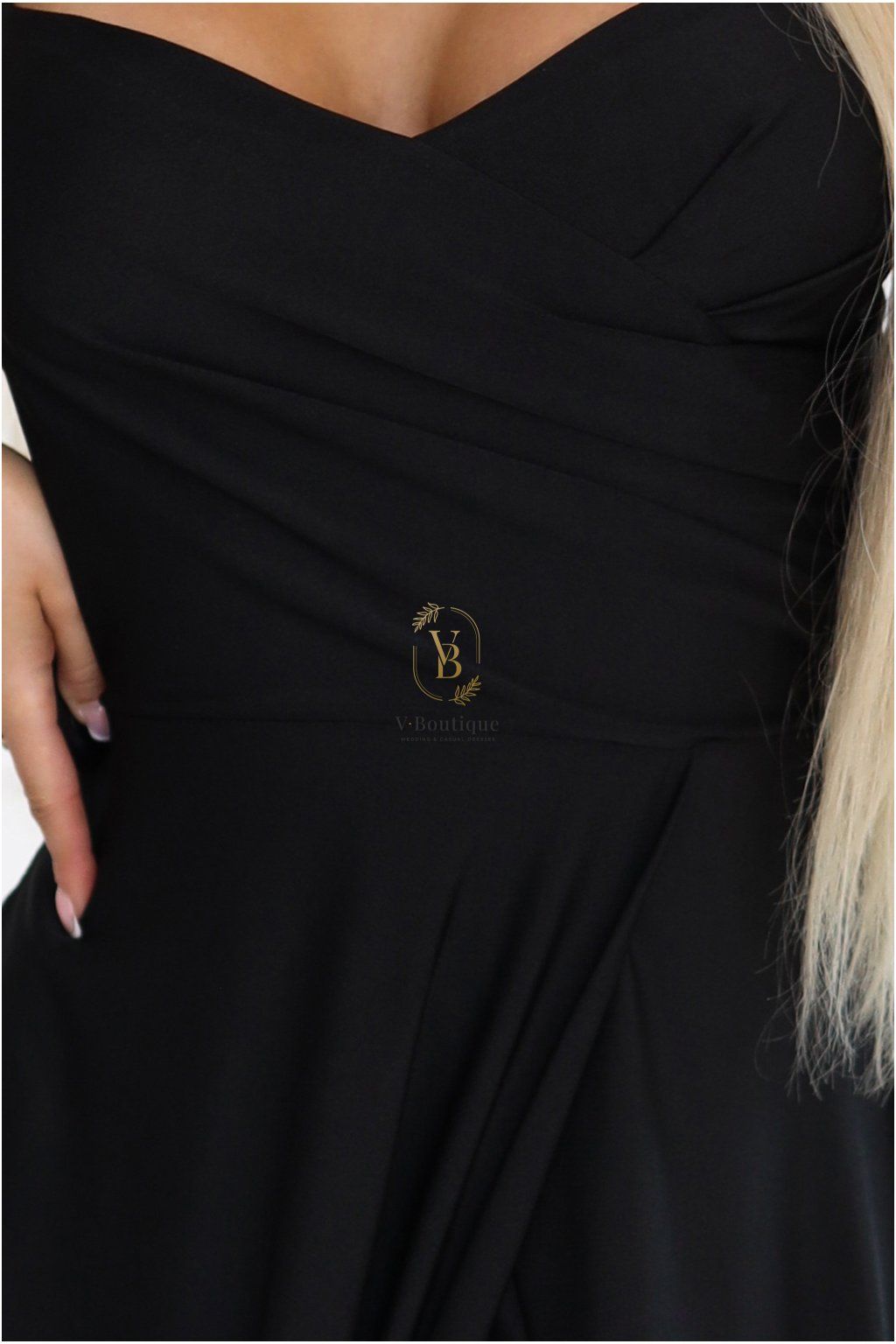 Dominantou šiat je hlboký prekrížený výstrih, ktorý krásne tvaruje dekolt, a rafinované riasenie v oblasti pása, ktoré efektne zdôrazňuje ženskú siluetu. Tenké špagetové ramienka nechávajú vyniknúť líniu krku a ramien, zatiaľ čo odhalený chrbát dodáva modelu punc luxusu. Tieto dlhé čierne šaty sú jasnou voľbou pre ženu, ktorá chce na plese alebo oslave pôsobiť sebavedomo a elegantne.