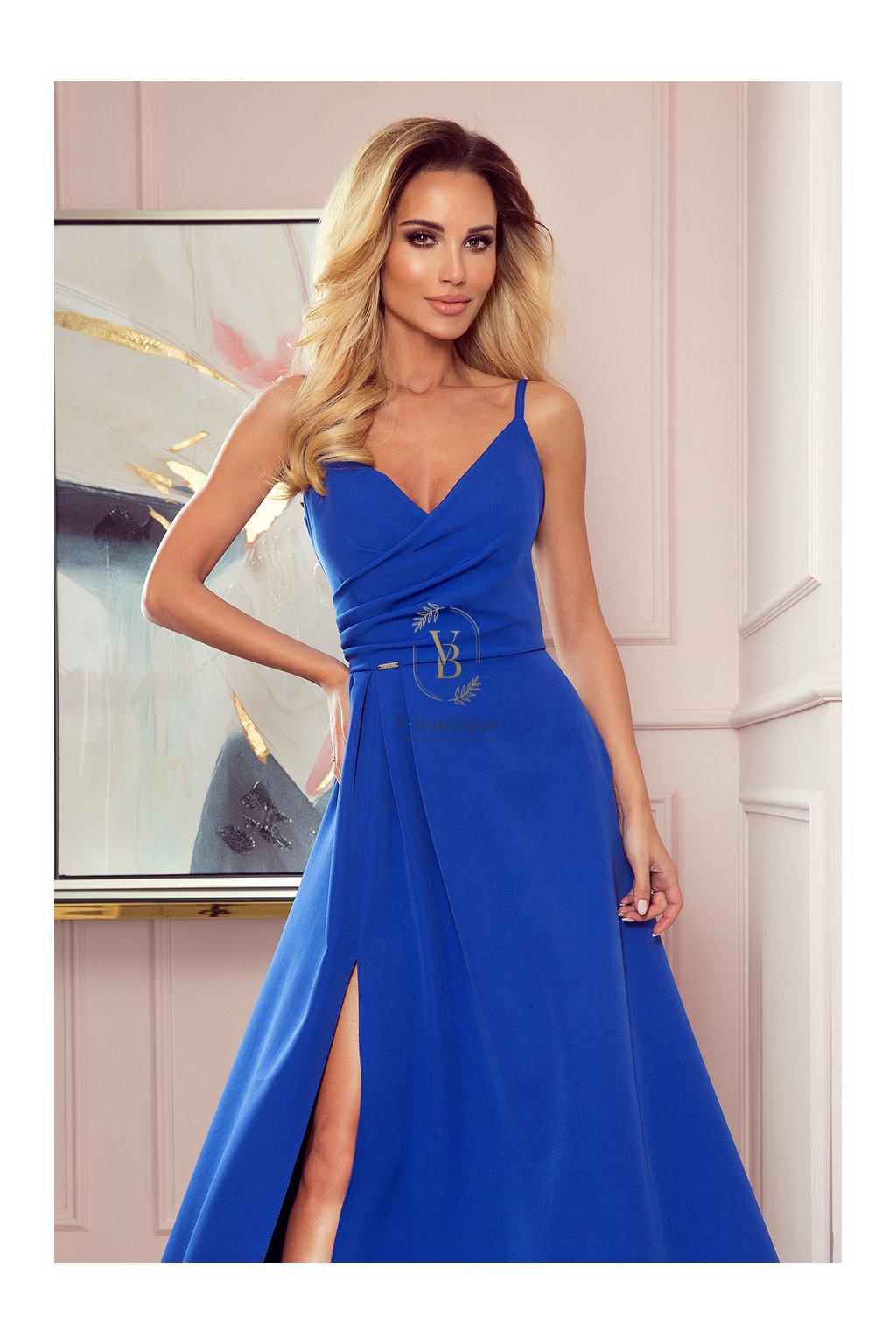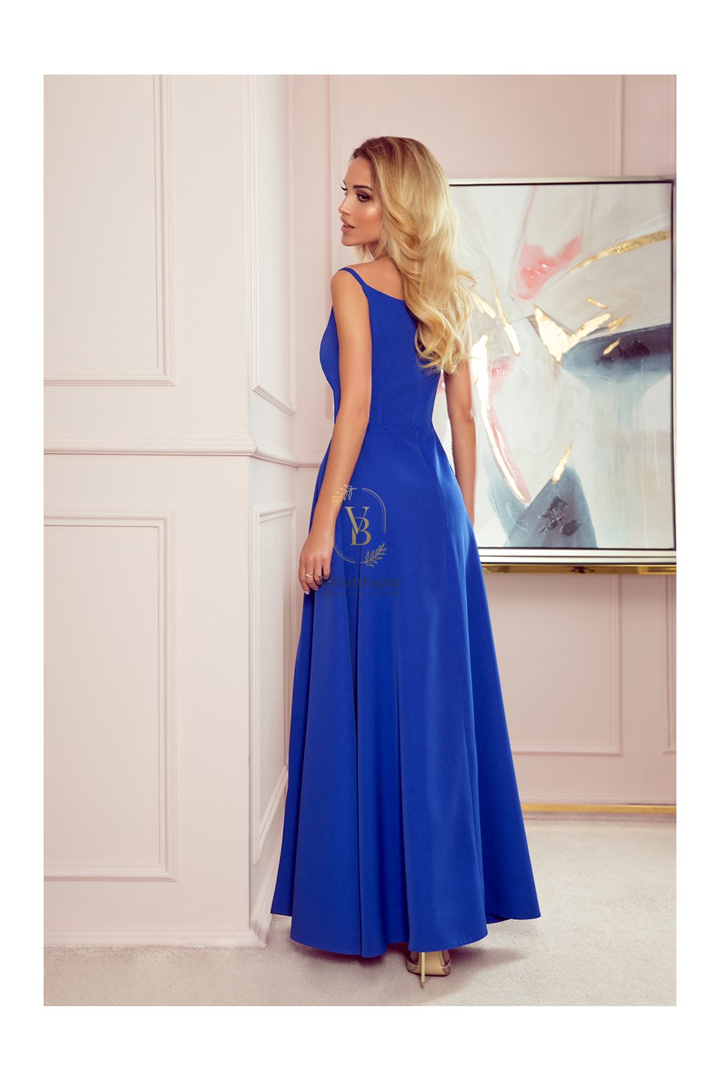 Tieto elegantné dlhé spoločenské šaty v odtieni kráľovskej modrej spájajú jednoduchosť so sofistikovaným štýlom.