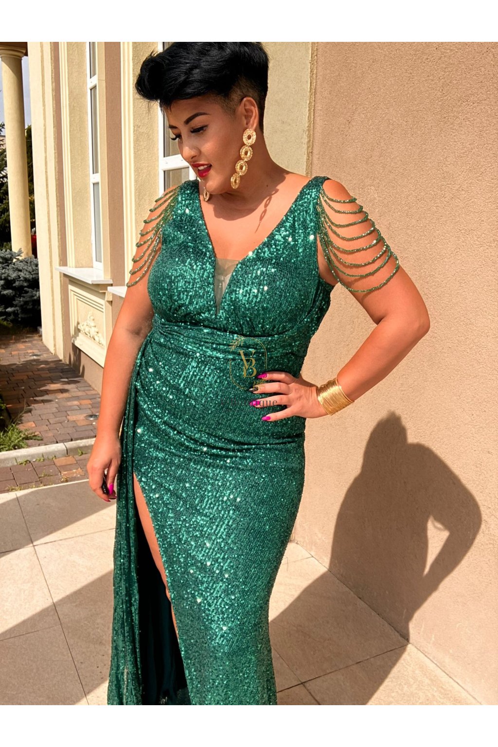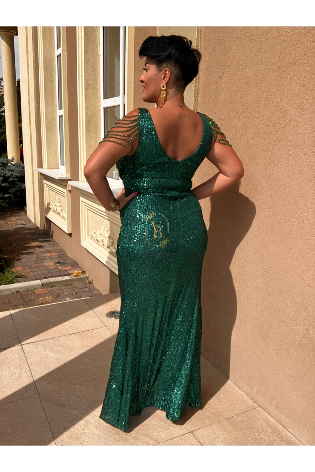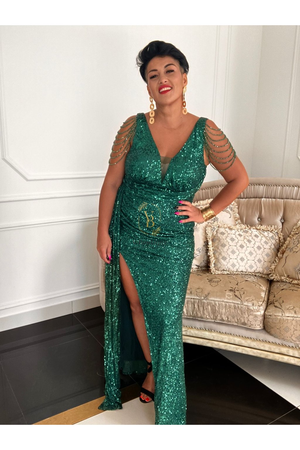 Dlhé smaragdovozelené spoločenské šaty zdobené trblietavými flitrami a elegantnou perličkovou aplikáciou na ramenách.