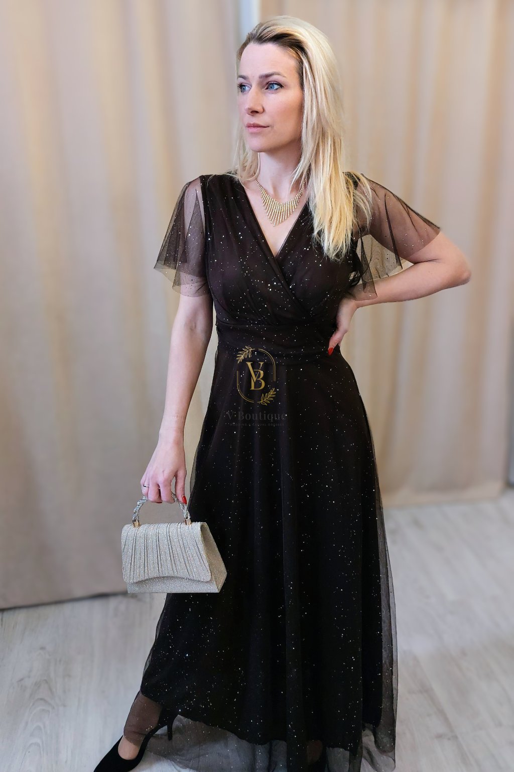 Zavinovací výstrih do V opticky predlžuje siluetu a krásne zvýrazňuje dekolt. Krátke tylové rukávy dodávajú modelu vzdušnosť a eleganciu bez toho, aby zakrývali ženské línie. Pás je jemne zvýraznený a splývavá sukňa sa pri chôdzi nádherne pohybuje, čo robí tieto šaty ideálnymi na plesy, svadby, spoločenské udalosti či večerné oslavy.