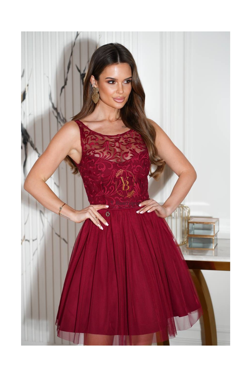 Bordové čipkované šaty s tylovou sukňou