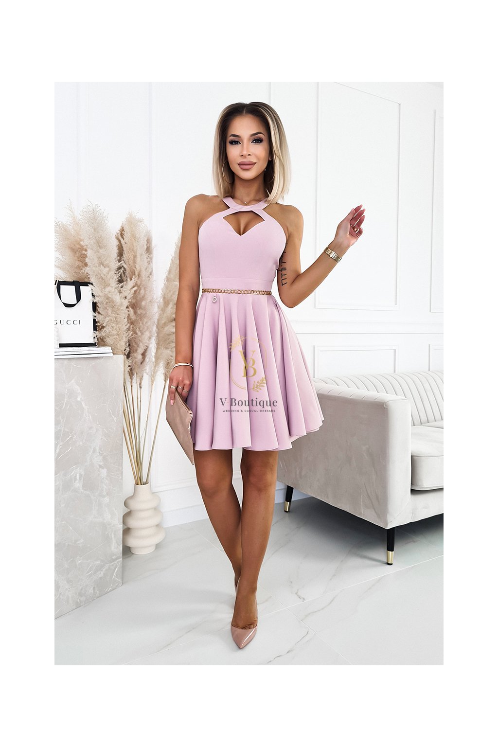 Tieto svetloružové/púdrové koktejlové šaty pôsobia žensky, jemne a zároveň elegantne. Áčková sukňa krásne splýva a vytvára ľahký, vzdušný efekt pri pohybe, zatiaľ čo moderný výrez v oblasti dekoltu decentne zvýrazňuje ženské krivky. Zlatý retiazkový detail v páse dodáva modelu luxusný nádych a zvýrazňuje siluetu.