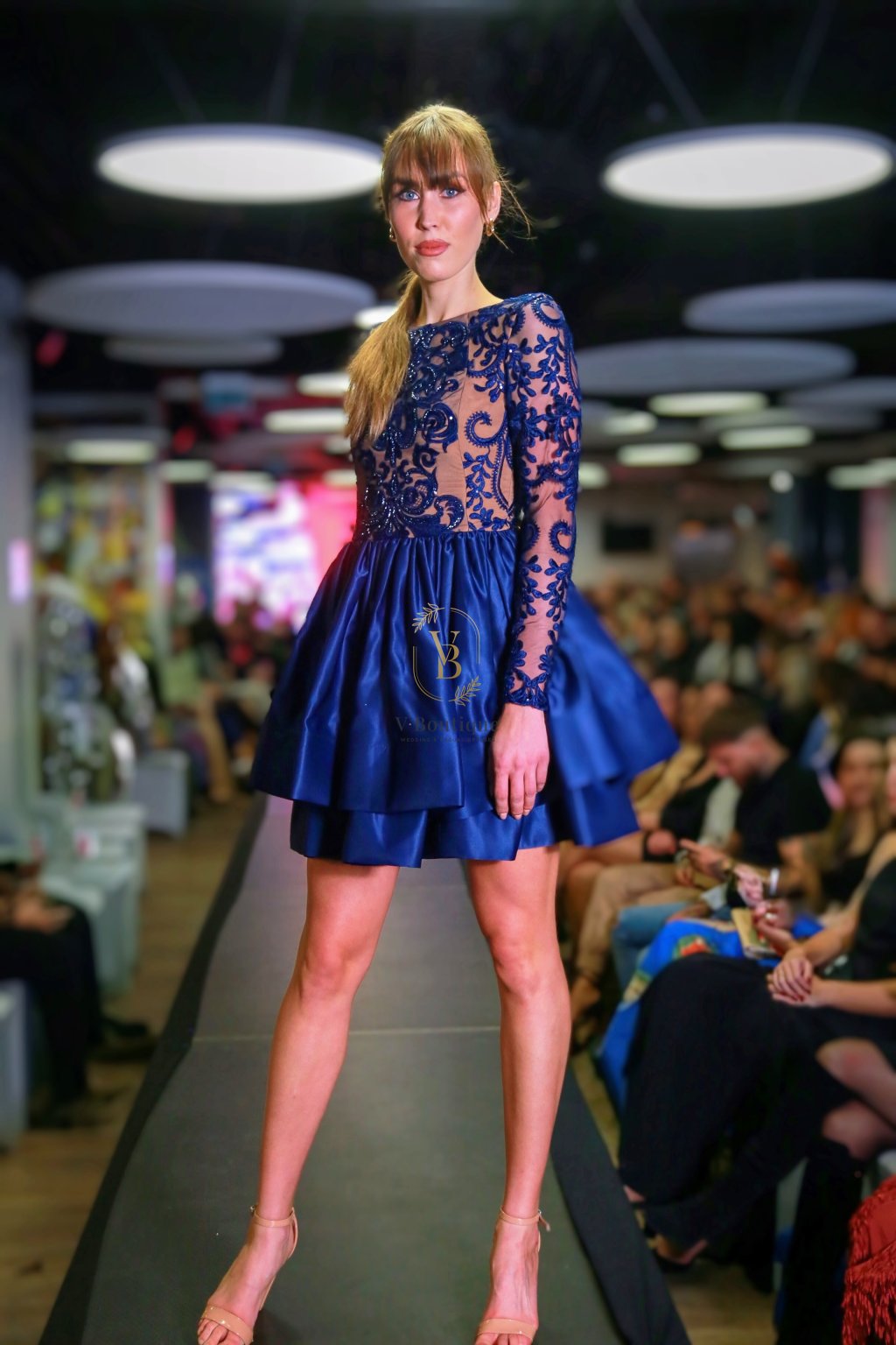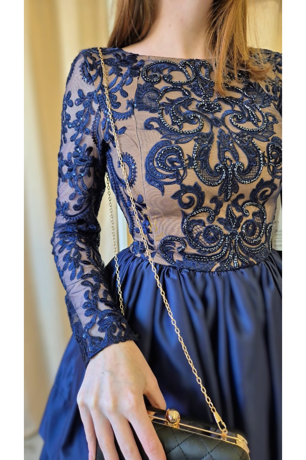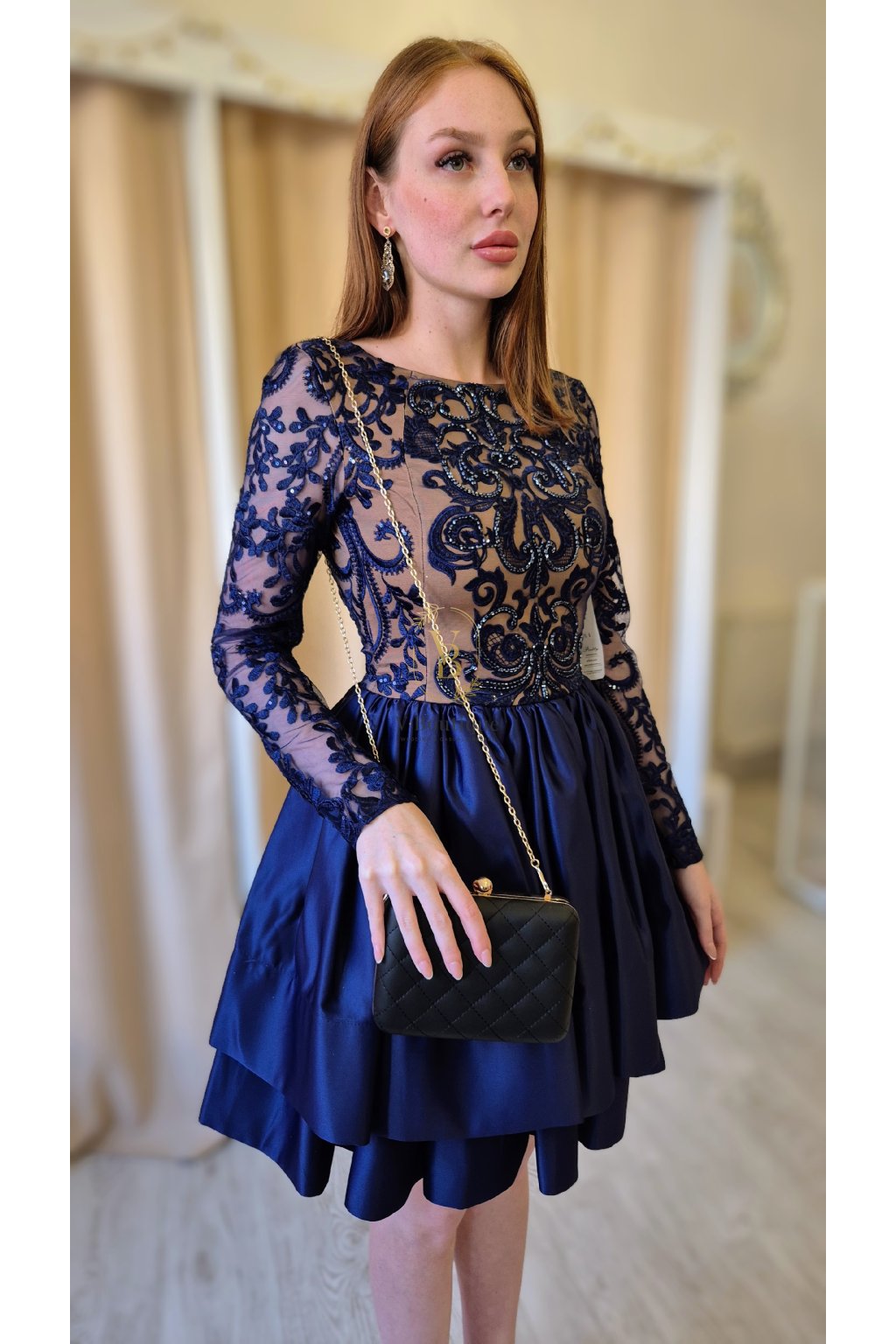 Tieto krátke spoločenské šaty v odtieni tmavomodrej farby zaujmú na prvý pohľad kombináciou luxusnej výšivky a ľahkej tylovej sukne. Bohato zdobený vrchný diel s dlhými rukávmi pôsobí elegantne a sofistikovane, zatiaľ čo hladká sukňa s jemným leskom dodáva modelu sviežosť a hravosť.