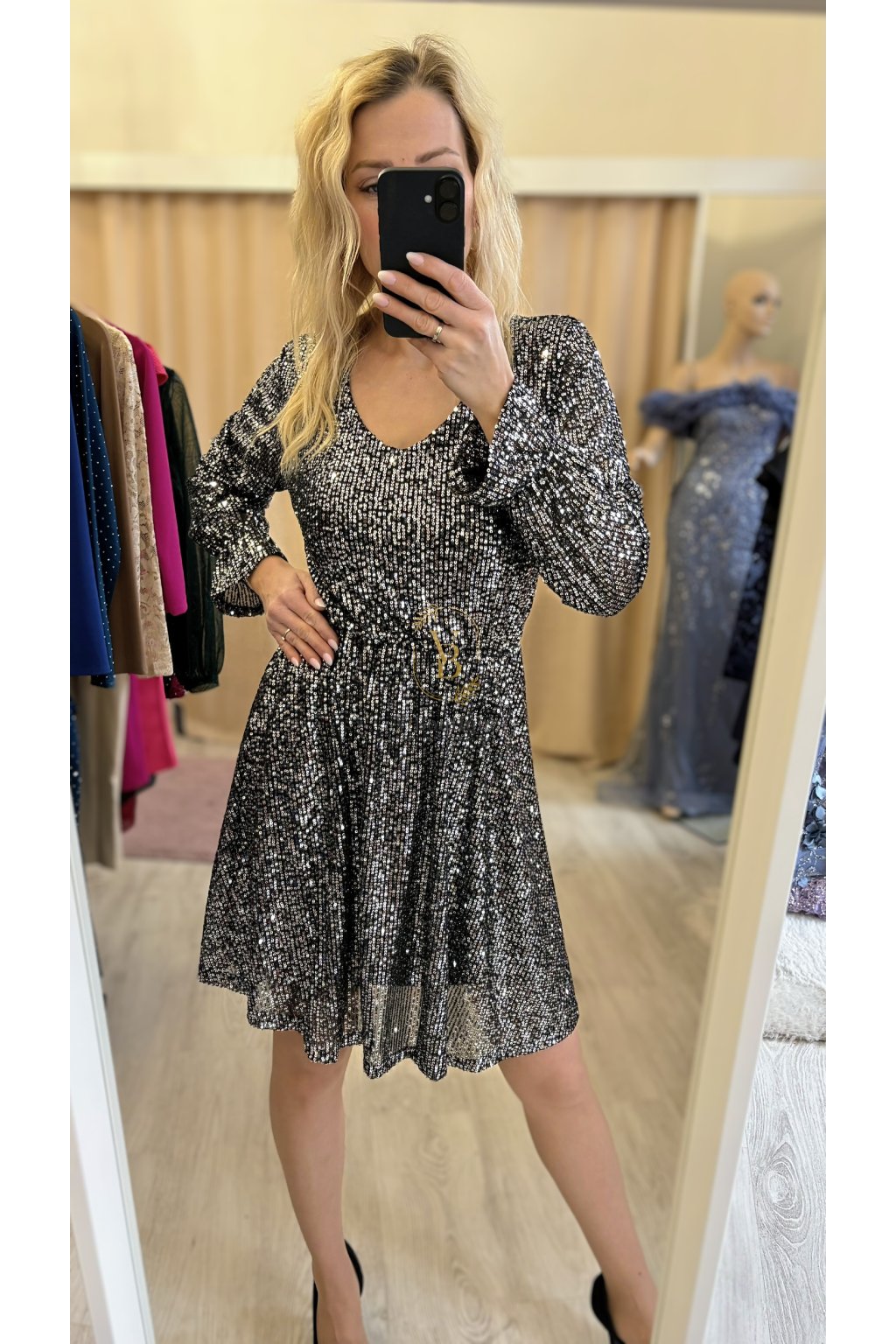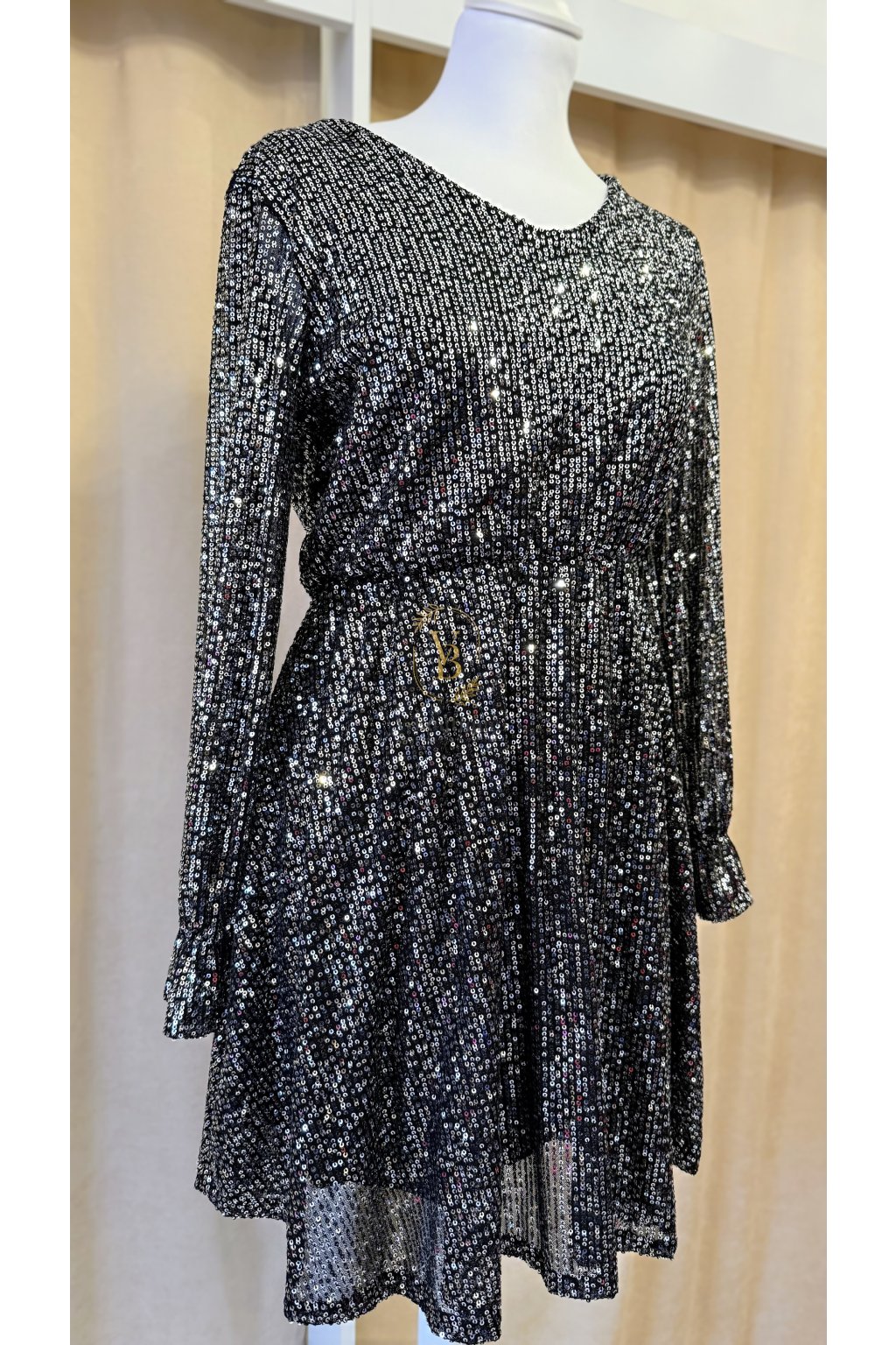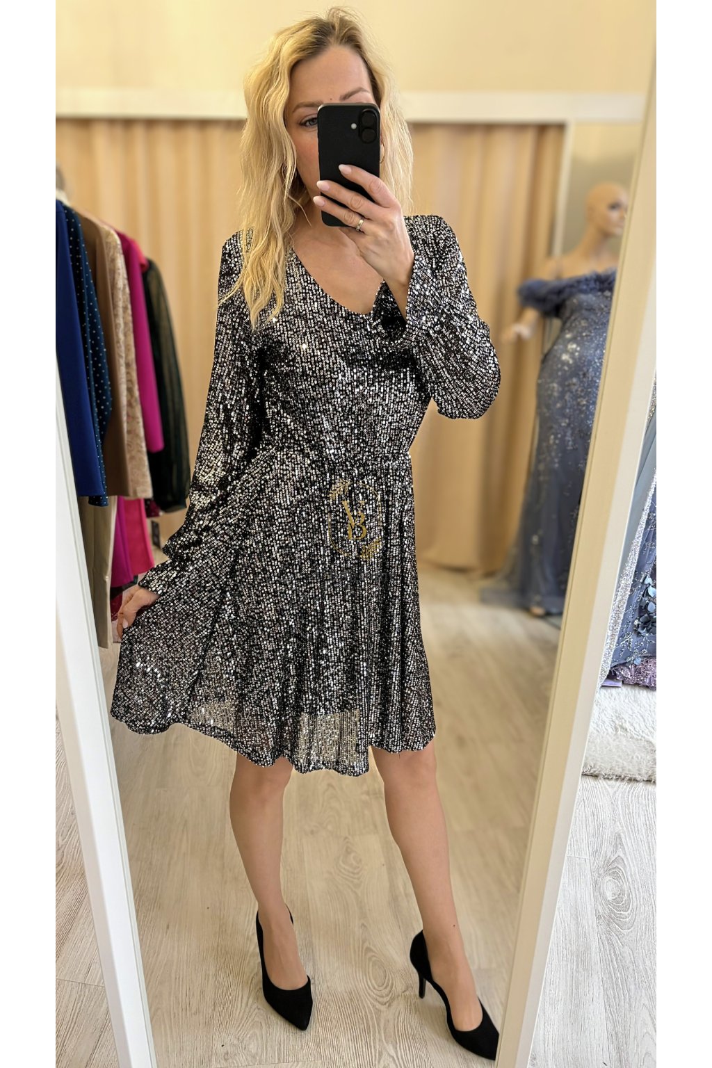 Elegantné čierno-strieborné midi šaty, ktoré zaujmú vysokým leskom a pohodlným strihom. Celý model je zdobený drobnými flitrami, ktoré vytvárajú výrazný trblietavý efekt bez prehnanej extravagancie.