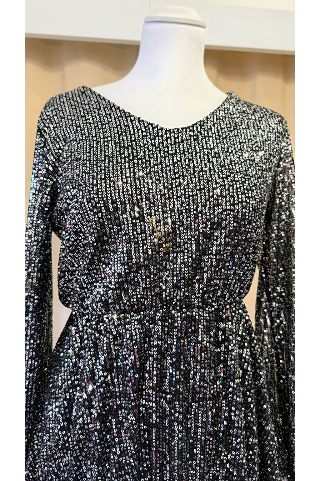 Čierno-strieborné flitrované midi šaty s dlhým rukávom