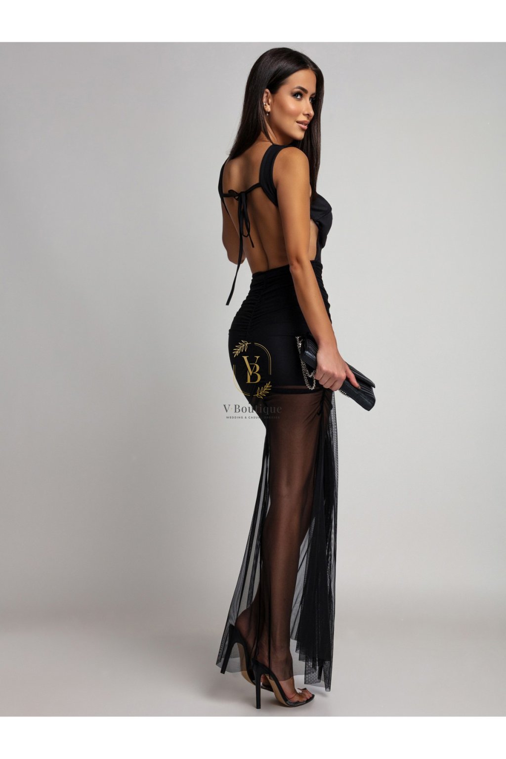 Priliehavý vrch plynulo prechádza do jemnej tylovej sukne, ktorá dodáva šatám ľahkosť a sofistikovaný kontrast. Odhalený chrbát s viazaním pôsobí zvodne, no stále veľmi vkusne. Tento model je ideálnou voľbou na večerné podujatia, oslavy či formálne spoločenské príležitosti, kde chcete pôsobiť výnimočne a žensky.
